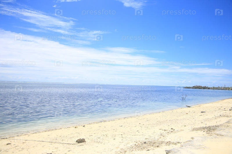 Пляж, песчаный берег и голубое небо с облаками на курорте в океане