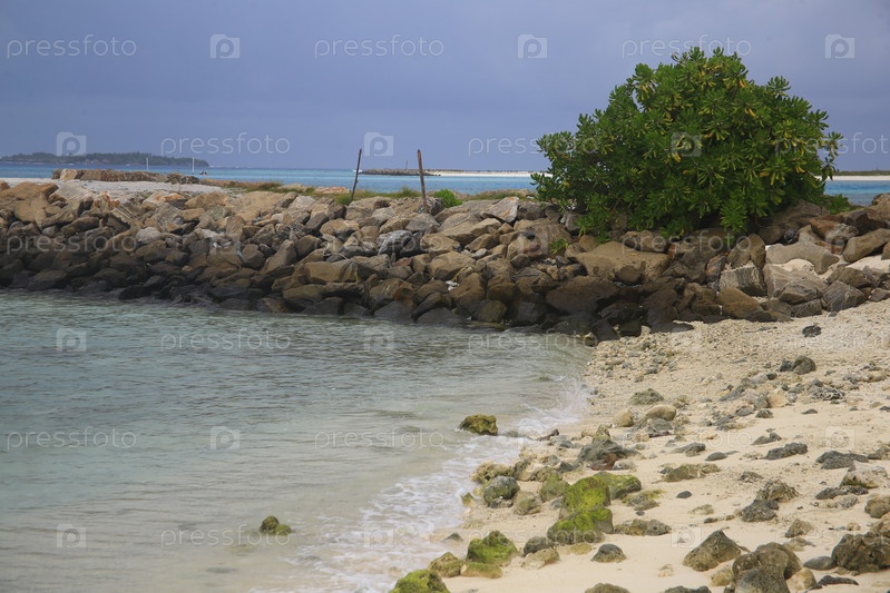 Пляж, песчаный берег с камнями и голубое небо с облаками на курорте в океане