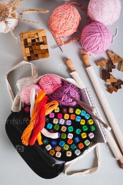 Аналоговый пакет из пряжи, маркеры, блокнот, вязаные иглы и верхние и вертикальные головоломки