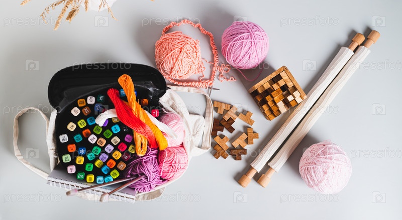 Аналоговый пакет из пряжи, маркеров, блокнотов, вязальных игл и загадок с веб-баннерами для верхнего просмотра