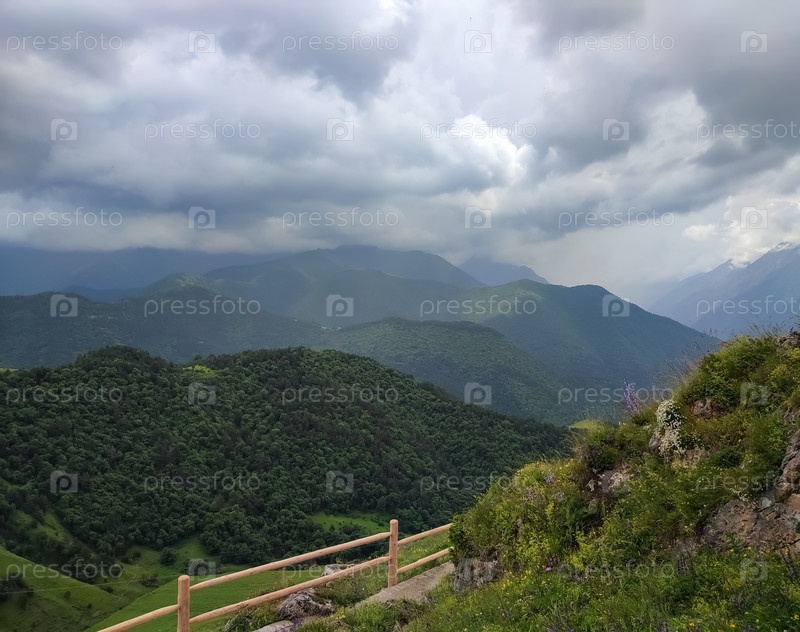 Горный пейзаж под штормовым небом с деревянным забором