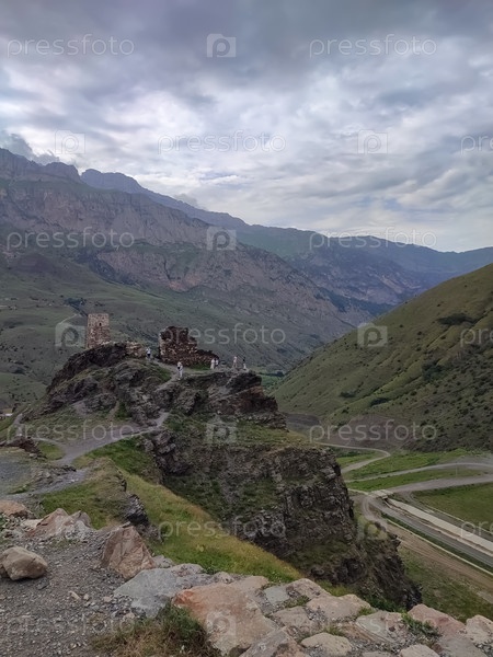 Горный серпентин в ущелье под облачным небом (Северная Осетия)