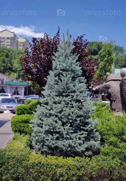 Голубая ель в дизайне городского ландшафта на фоне летнего неба и улицы