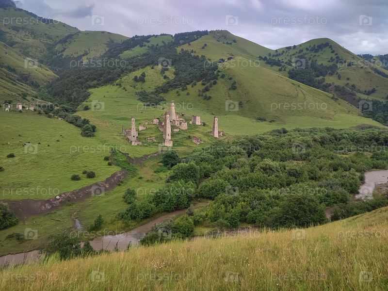 Древние башни в горной долине на фоне облачного неба
