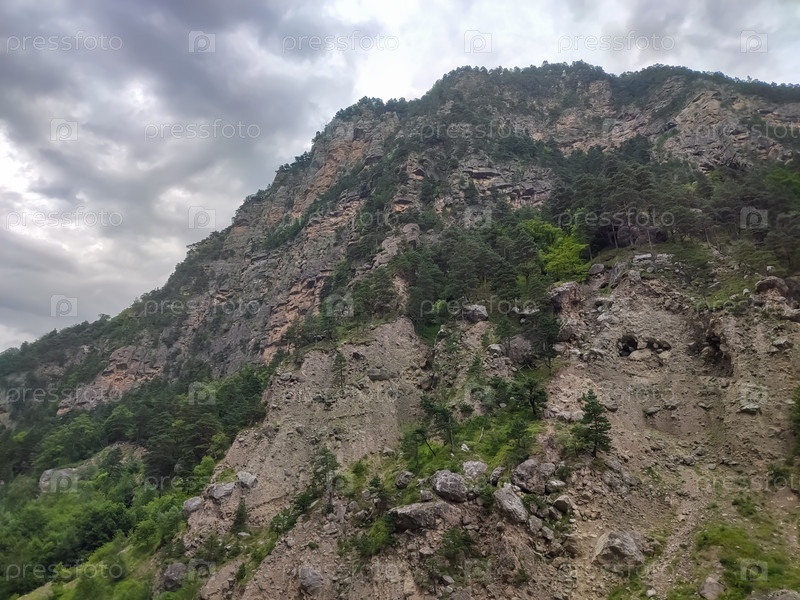 Тяжелая скалистая гора с редкой зеленью под облачным небом