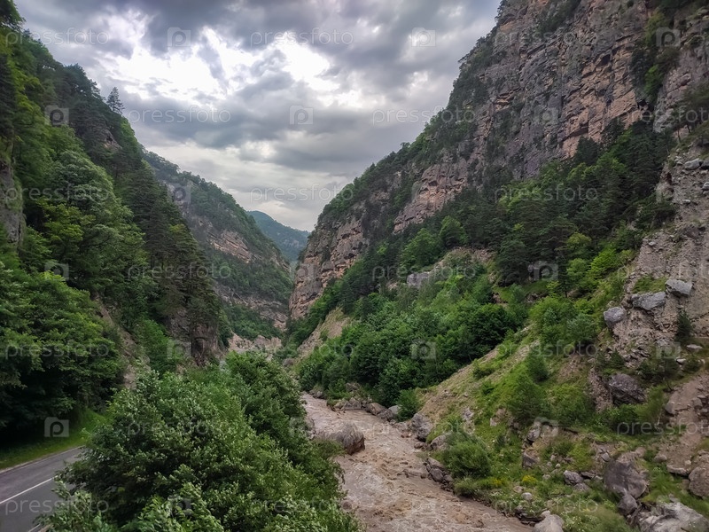 Тяжелая скалистая гора с редкой зеленью под облачным небом