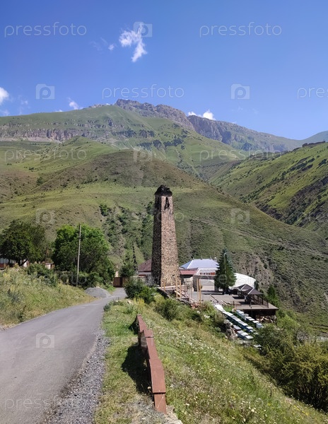 Башня в Кавказских горах на фоне зеленого склона, дороги и летнего неба