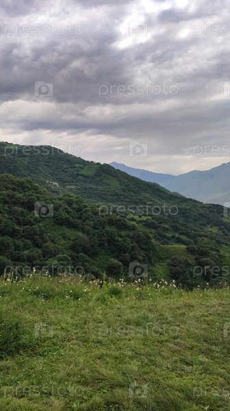 Горный пейзаж под облачным небом с зелеными склонами и лугом (Ингушетия)