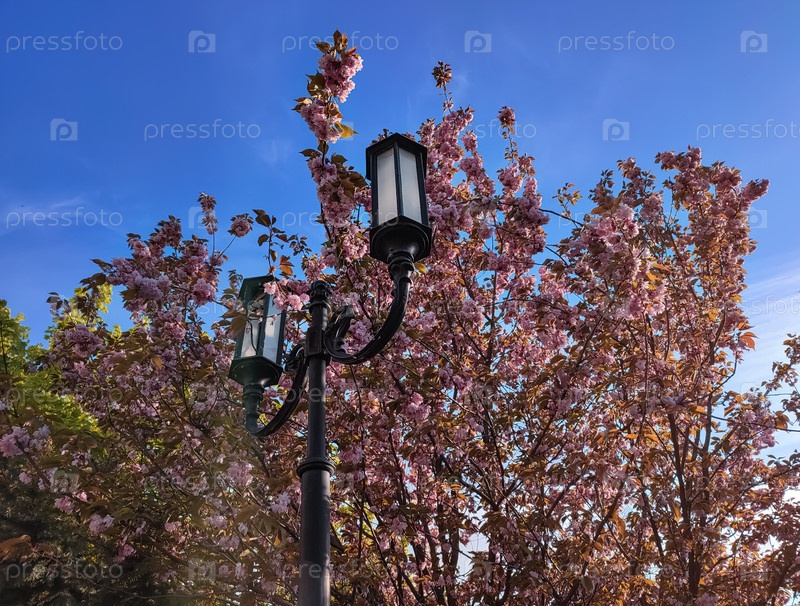 Уличная лампа на фоне цветов вишни и ярко-синего неба