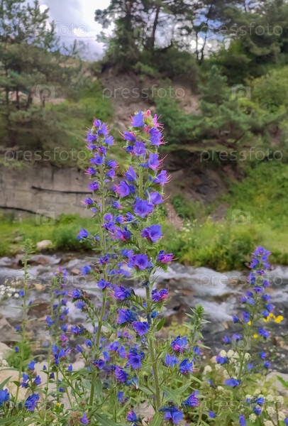 Ярко-синие фиолетовые цветки синяка (Echium vulgare) рядом с кипящей рекой в летнем пейзаже