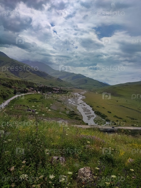 Извилистая горная долина с рекой и нежными склонами под облачным небом