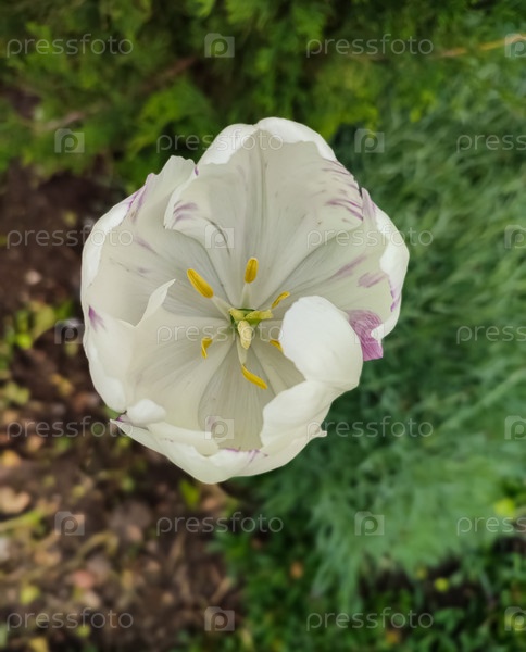 Верхний вид разворачивающегося белого тюльпана с фиолетовыми штрихами и желтыми штаммами
