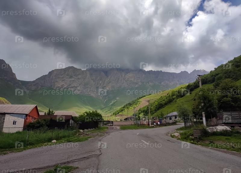 Вход в горную деревню под висящими штормовыми облаками (река Ингушетия)