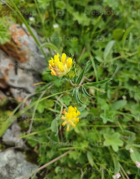 Ярко-желтые цветы на фоне сочной зелени и камня