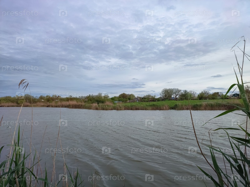 Тихая заморская вода с тростниками на фоне облачного неба и деревенских зданий