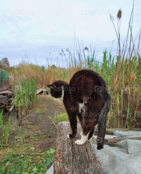 Уличный котенок смокинг опирается на бревно среди тростников