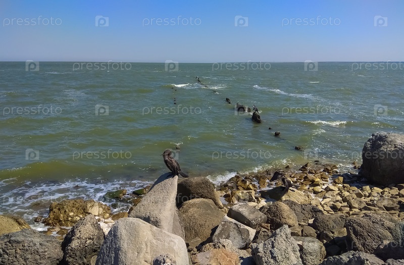 Бакеланы (Бакланы) на каменистом берегу моря в солнечный день