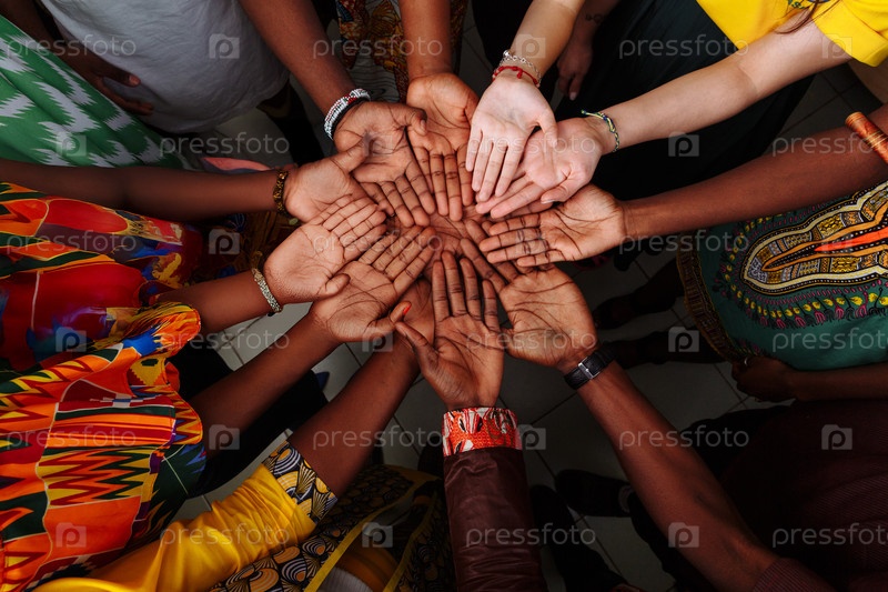 Руки группы многонациональных людей: африканцев, латиноамериканцев и европейцев, которые держатся вместе в кругу