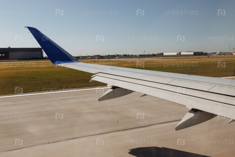 Вид на крыло самолета во время движения по взлетно-посадочной полосе аэропорта под ясным голубым небом в солнечный день