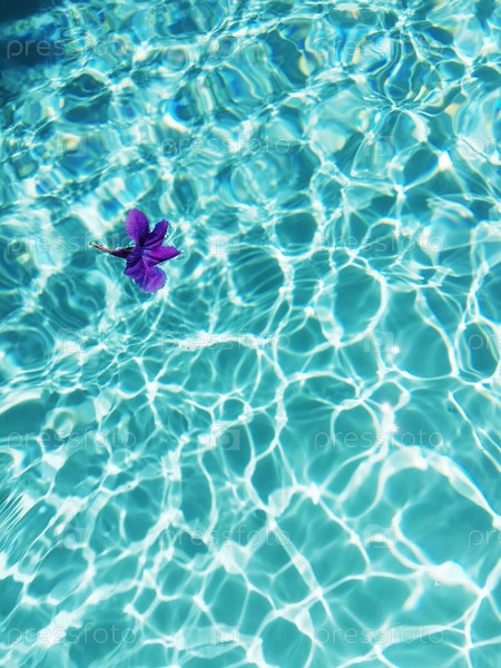 Фиолетовый цветок плавает на чистой бирюзовой воде бассейна с яркими отражениями солнца