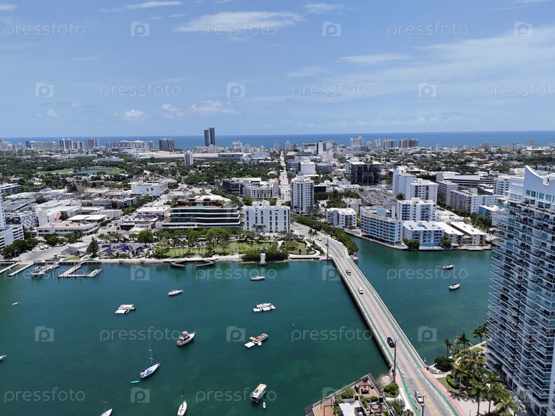 Вид с воздуха на панораму Майами и прибрежные острова над Бискейнским заливом в солнечной Флориде, США