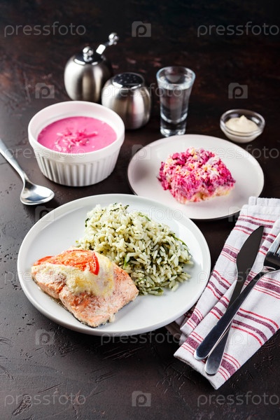 Обеденный стол с тарелкой запеченной красной рыбы со сыром, рисом со шпинатом, свекольным супом с сметаной и салатами, меню для обеда в ресторане, деловой ланч