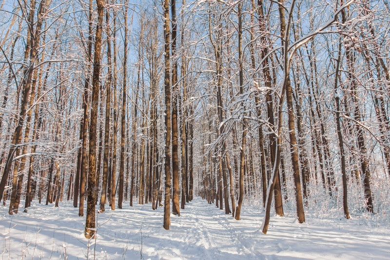 Путь в зимний лес со снегом на деревьях и полу в солнечный день