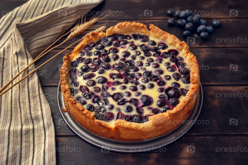 Рустический торт с чернилами в сливочной начинке на деревянном фоне с кухонным полотенцем и пшеничными колосьями