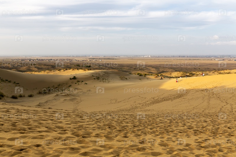 Захват Сарыкума, крупнейшей песчаной дюны в Европе на охраняемом участке Дагестанского заповедника, Россия.Туристы гуляют по склонам под лучами заходящего солнца