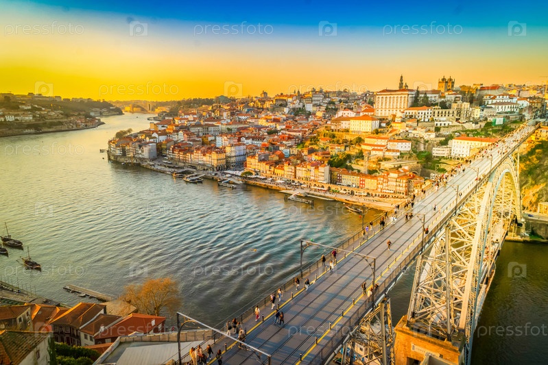 Живописный, красочный вид на старый город Порто со знаменитым мостом ночью, Португалия с мостом Понте Дом Луис через реку Дуро