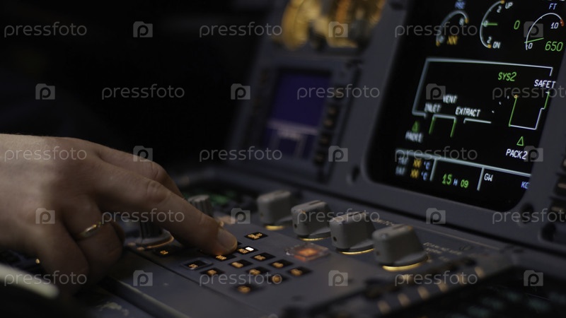 Элемент управления автопилотом авиалайнера. Переключательная панель на пилотской палубе самолета. рычаги двухмоторного пассажирского самолёта. Пилот управляет самолетом. Бортовый компьютер