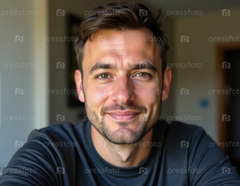 Молодой человек с очаровательной улыбкой удобно сидит в хорошо освещенной комнате