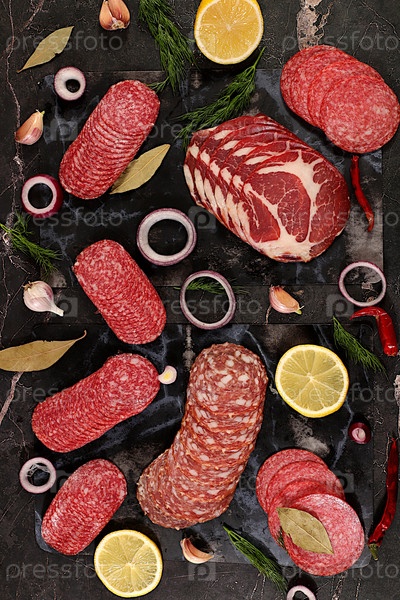 Ассортимент различных видов колбас, копченое мясо, салями и сосиски из игры с лимоном, пряностями и травами на бетонном столе. Реклама и баннер для магазина, меню в кафе или ресторане