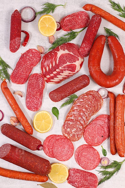 Ассортимент различных видов колбас, копченое мясо, салями и сосиски из игры с лимоном, пряностями и травами на бетонном столе. Реклама и баннер для магазина, меню в кафе или ресторане