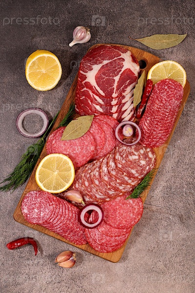 Ассортимент различных видов колбас, копченое мясо, салями и сосиски из игры с лимоном, пряностями и травами на бетонном столе. Реклама и баннер для магазина, меню в кафе или ресторане