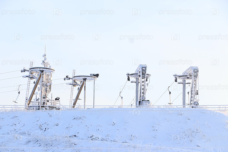 Лифты горнолыжного курорта 'Парк Туутари' в Ленинградской области, покрытые толстым слоем льда. Зимний пейзаж в центральной России. Красивая зимняя пригласительная карточка для туристов