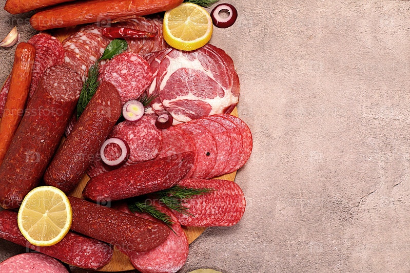 Ассортимент различных видов колбас, копченое мясо, салями и сосиски из игры с лимоном, пряностями и травами на бетонном столе. Реклама и баннер для магазина, меню в кафе или ресторане