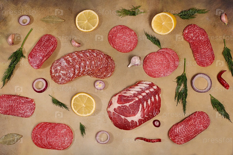 Вкусные, ароматные закуски из различных видов салями на праздники. Выбор копченных и сушеных колбас и специй на фоне кухни. Реклама магазинов и меню