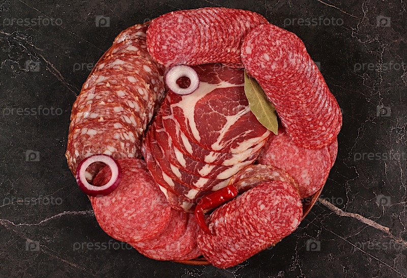 Вкусные, ароматные закуски из различных видов салями на праздники. Выбор копченных и сушеных колбас и специй на фоне кухни. Реклама магазинов и меню