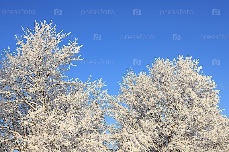 Прекрасные сказочные деревья в толстом слое мороза и снега во время сильных заморозков на голубом небе. Красивая зимняя пригласительная карточка для туристов. Красота холодного сезона для путешествий