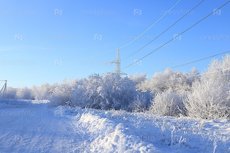 Зимний пейзаж в центральной России. Феи красивые деревья в толстом слое морозов и снега во время сильных заморозков вдоль дороги. Красивая зимняя пригласительная карточка для туристов