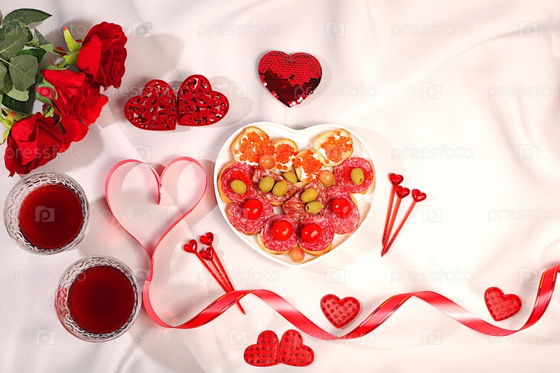 Сердце свежих каннапесов с салями, икры, сыром и виноградом для буфета с розами, красным вином и красными сердцами на праздничном столе. блюда Дня святого Валентина, рекламный баннер, приглашения в бар, меню