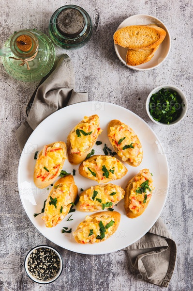 Мини-печенные бутерброды с крабовыми палочками, яйцами и сыром на тарелке на столе