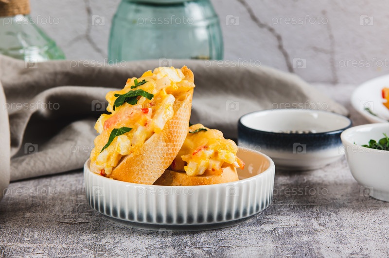 Мини-печенные бутерброды с крабовыми палочками, яйцами и сыром на тарелке на столе