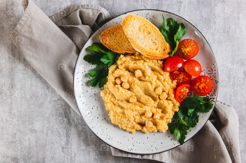 Чистый горох, помидоры, тост и зелень на тарелке за столом
