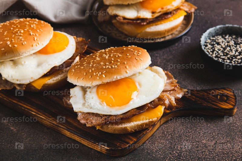 На столе на доске есть бутерброд для завтрака с яйцами, беконом и сыром