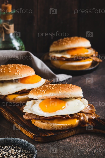 На столе на доске есть бутерброд для завтрака с яйцами, беконом и сыром