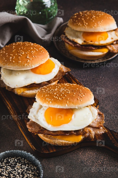 На столе на доске есть бутерброд для завтрака с яйцами, беконом и сыром