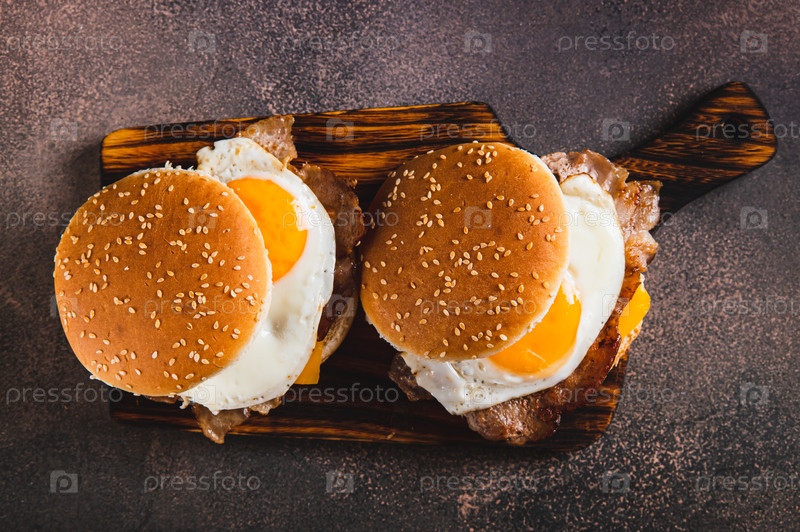 На столе на доске есть бутерброд для завтрака с яйцами, беконом и сыром
