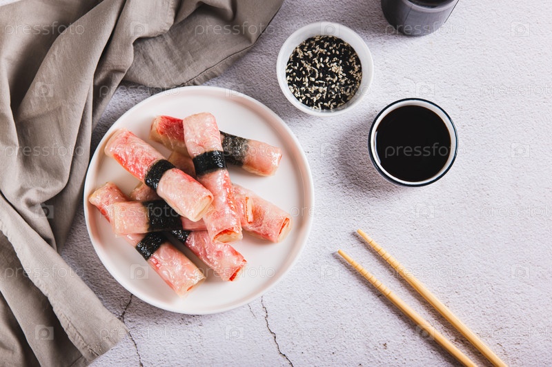Жареные весенние роллы с крабовыми палочками и водорослями нори на тарелке на столе